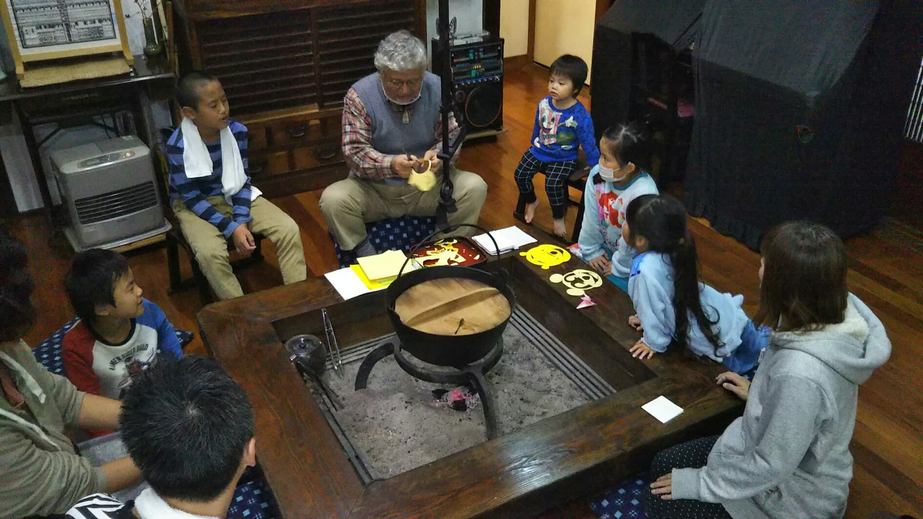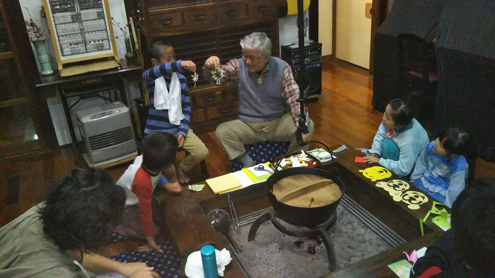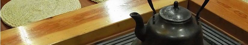 鉄鍋のぶら下がる囲炉裏のまわりでは主人が紙切りや寄席文字を披露することも。大きく黒光りする柱や梁には民家だった頃の名残があります。